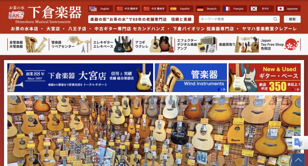 買取品目エレキギター、アコースティックギター、バイオリン、チェロ、マンドリン、ウクレレ、フルート、クラリネット、サックス、トランペット、ピッコロ、コルネット、ホルン、トロンボーン、三味線、尺八、レコードプレーヤー、アンプ、スピーカー、エフェクター、その他音響機器